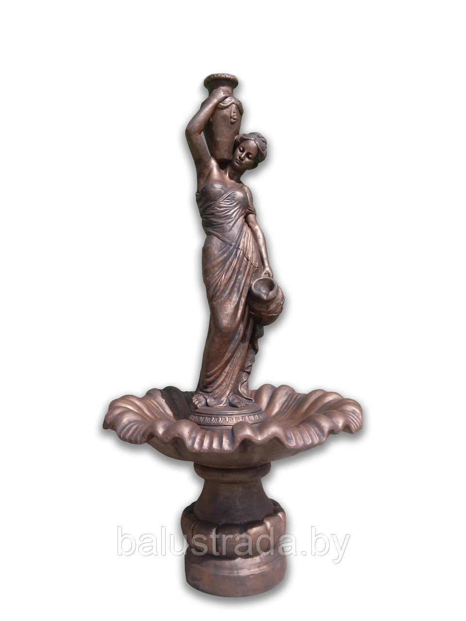 Бетонный фонтан "Кувшин" выполнен в виде девушки с двумя кувшинами. Фонтан может работать автономно (вода будет циркулировать из чаши вверх) или его можно установить в садовый пруд. Возможно установить в верхний кувшин фонарь, как у светильника "Кувшин". Фонтан сделан из бетона и окрашен фасадной краской, поэтому его с уверенностью можно использовать под открытым небом, не боясь что с ним что-то произойдет.